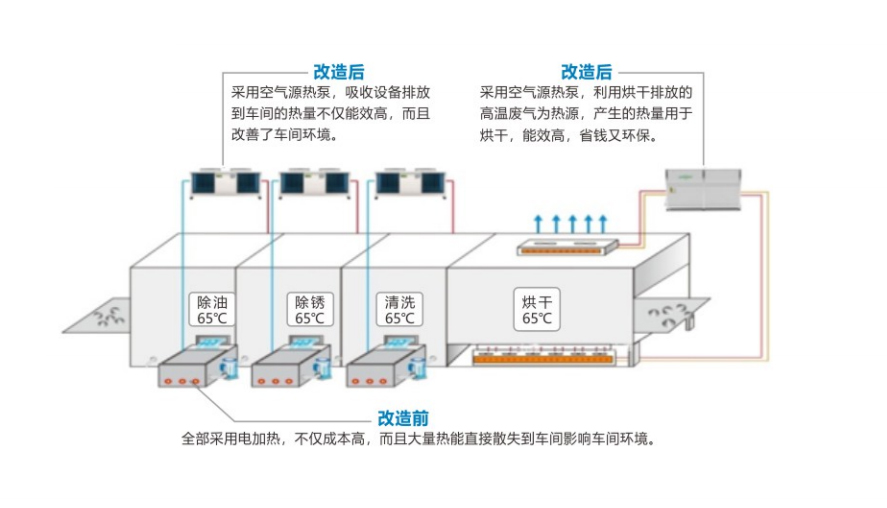 化工、冶金、电镀、纺织印染、食品、屠宰、电力、医药等行业,因生产特性,为了保证生产工艺要求,需要消耗大量的一次能源,同时,伴随生产也会有大量的低品位热量通过冷却塔等方式散发到大气中去。这样一方面,因为应用一次能源,造成大量的石化能源的消耗,同时因石化能源消耗过程中对大气、环境的污染加剧。另外因为生产过程中通过冷却塔将大量的废热排放到大气中,形成热岛效应,同时排放过程中伴随着大量的水汽形成了水源的资源浪费。在实际应用过程中,如何将排放的热量回收回来,作为前端的生产提供能量是主要的应用研究方向。目前主要的应用模式为简单的回收利用。